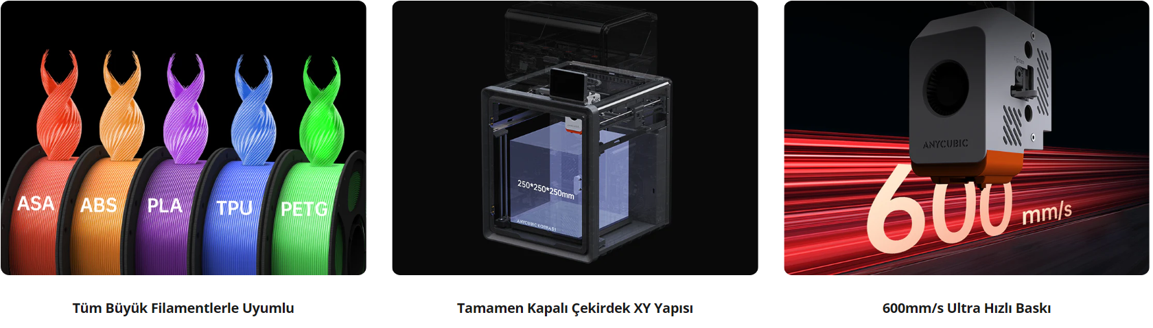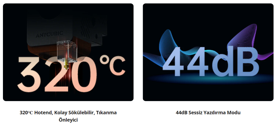 Yazıcının 320°C’ye kadar ısınabilen tam metal sıcak ucu, PLA, ABS, PETG, ASA ve TPU gibi farklı filament türlerini destekleyerek esnek bir kullanım sunar. Kullanıcı dostu dokunmatik ekranı ve sezgisel yazılımı, hem yeni başlayanlar hem de deneyimli kullanıcılar için idealdir. Sağlam çerçevesi, baskı sırasında mükemmel denge sağlayarak hassas ve tutarlı sonuçlar elde edilmesine olanak tanır.