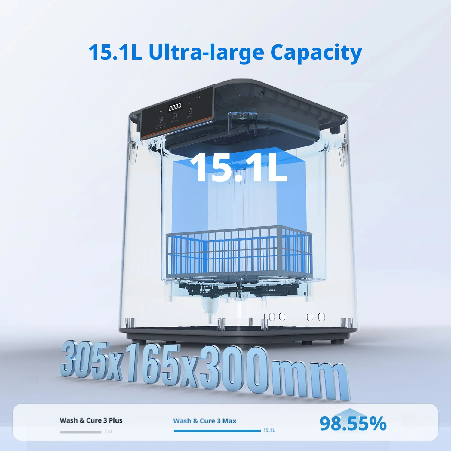 Anycubic Wash & Cure Max, piyasadaki çoğu yıkama ve kürleme makinesinin boyutlarını aşarak 14,9 litreye (15,7 litre) kadar su tutabilir. 300*165*300 mm'lik (11,8"x6,5"x11,8") etkileyici maksimum temizleme boyutu, piyasada bulunan 13,6"(35 cm) ve altı ölçülere sahip hemen hemen tüm tüketici sınıfı reçine 3D yazıcılarla uyumludur.
