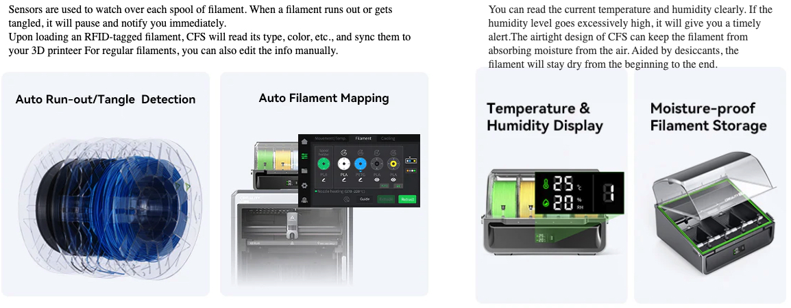 CFS, filament yükleme, boşaltma ve geçiş işlemlerini otomatikleştirir. Anormal bir durum tespit edilirse baskıyı durdurur ve kullanıcıyı bilgilendirir, böylece hatasız bir baskı süreci sunar.