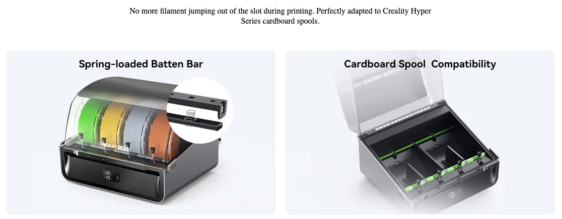 Yeni tasarım sayesinde filament baskı sırasında yuvasından çıkmaz. Özellikle Creality Hyper serisi karton makaralarla tam uyum sağlar, daha güvenilir ve pürüzsüz bir baskı deneyimi sunar.
